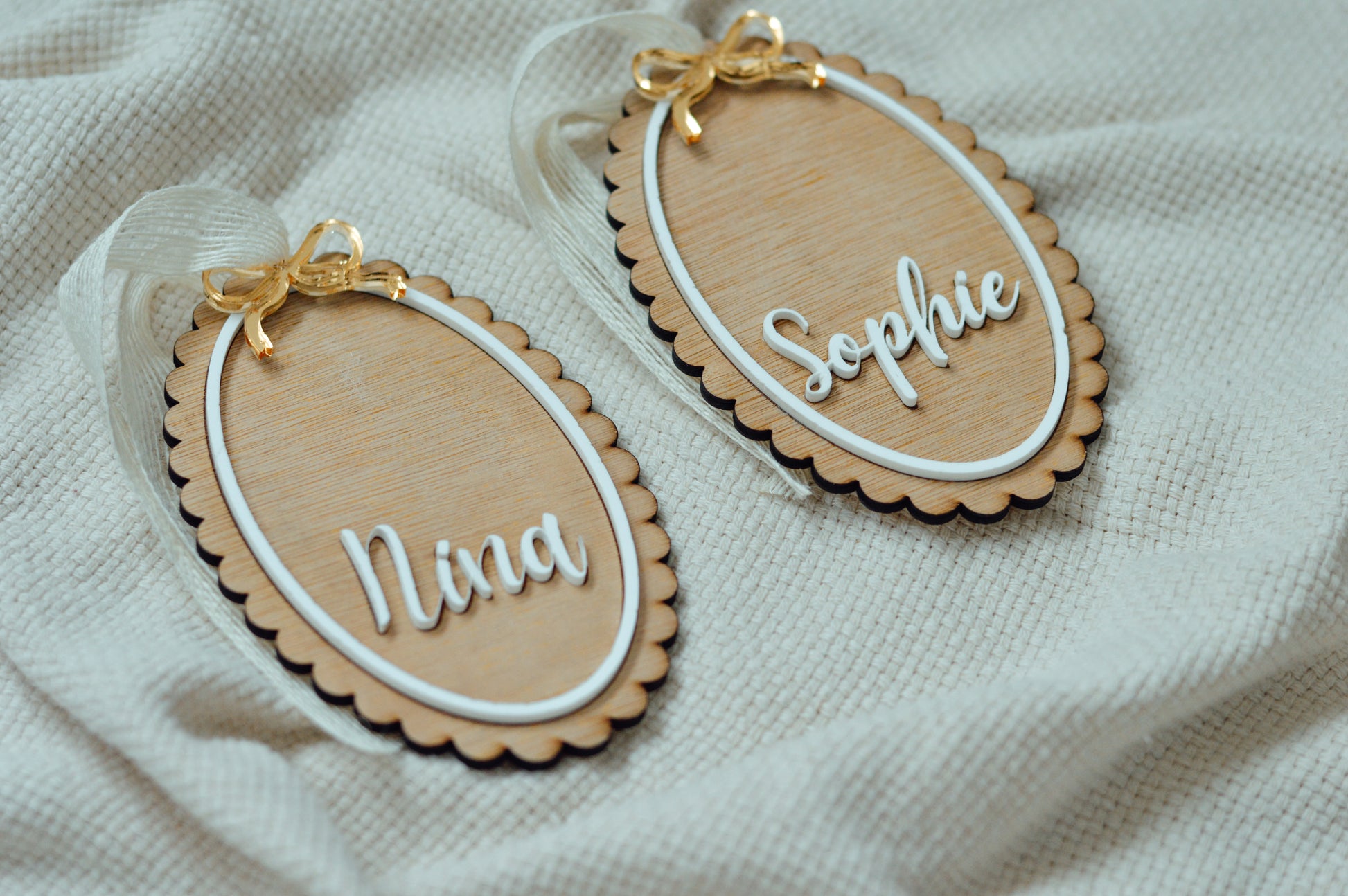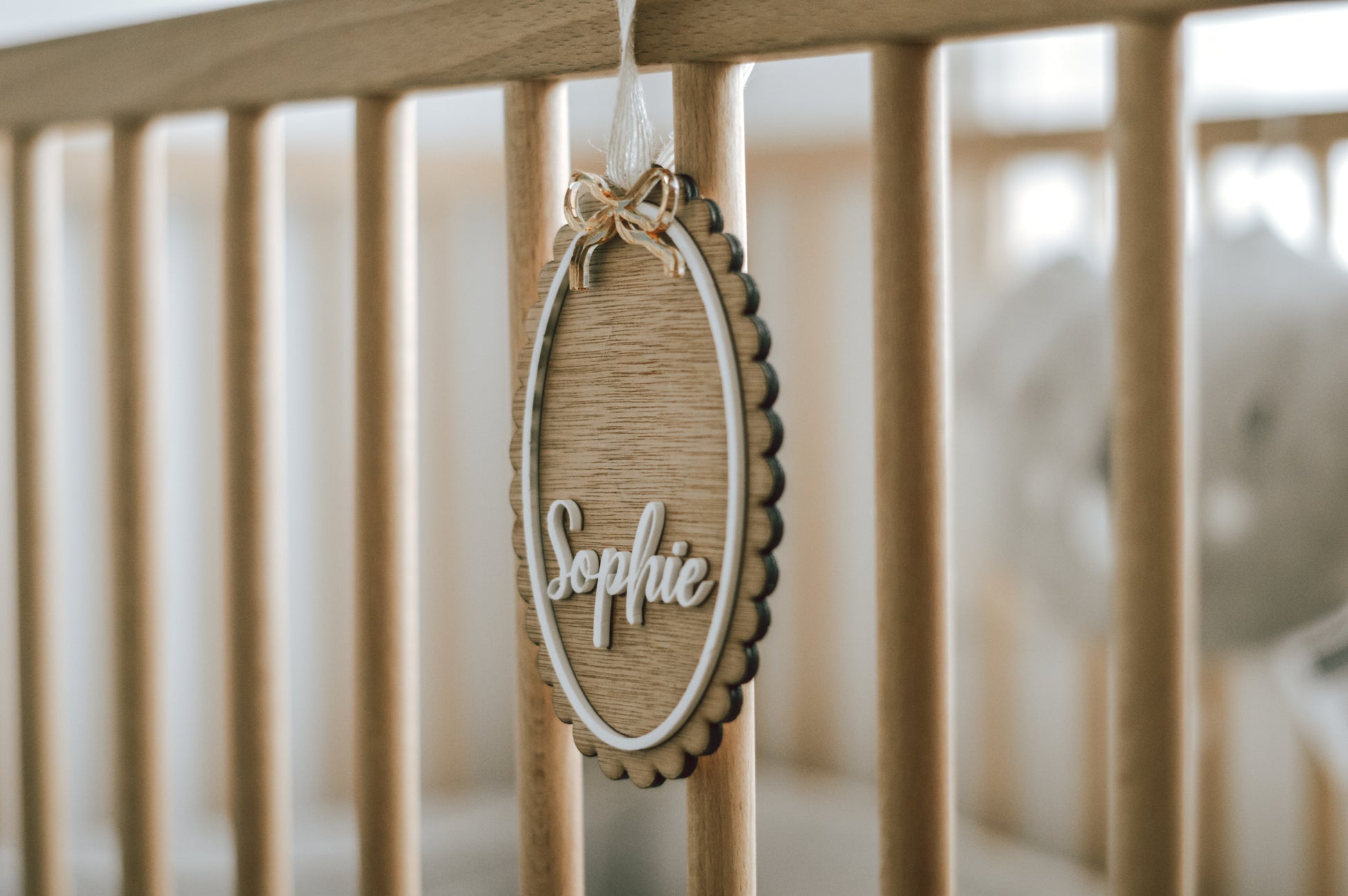 Our Personalized Scallop Baby Name Sign is handcrafted in wood and detailed with white and gold acrylic layers, creating a timeless piece that blends warmth, texture, and sparkle.