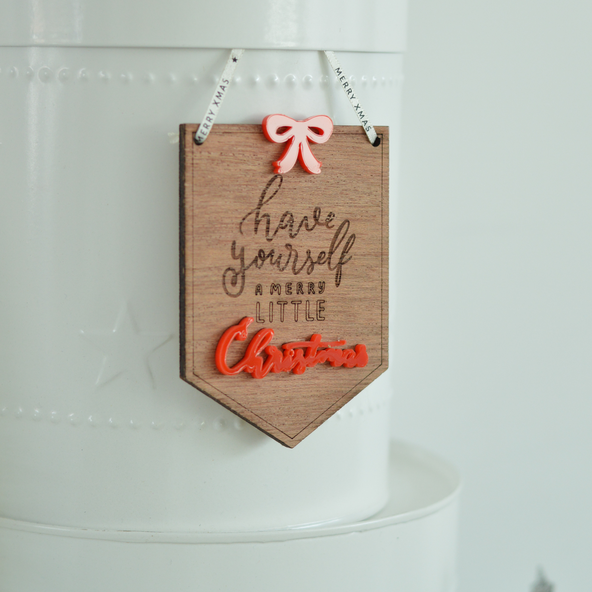 Red acrylic accents (“Christmas” and bow detail)